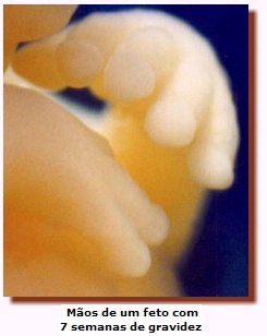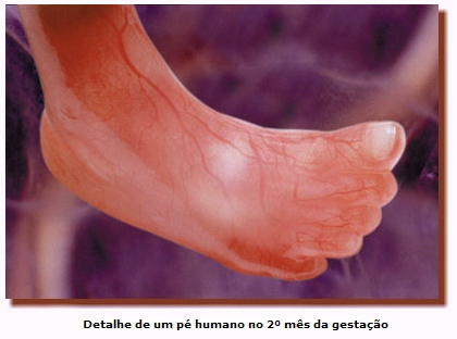 Em certas circunstâncias, quando há incompatibilidade de fator RH entre o sangue da mãe e do pai do futuro bebê e não se tomam as devidas providências médicas, esta barreira hormonal falha e o bebê é destruido como seríamos destruidos todos nós se a natureza não tivesse descoberto este recurso justamente por não sermos partes do corpo de nossas mães. Isto é apenas mais uma de centenas e centenas de muitas evidências de uma verdade muito clara: o futuro bebê já é outra pessoa, com seu próprio código genético, seu próprio sistema imunológico, seus prórprios órgãos, sua própria individualidade. Se você está pensando em fazer um aborto, não minta para você mesma. Quem você está matando é seu próprio filho já formado. Não existe modo de negar esta verdade, e nossa própria natureza sabe disto mesmo que queiramos negá-lo. A segunda foto é um detalhe de um pé humano no segundo mês de gravidez, iluminado desde o fundo para poder mostrar a riqueza da vascularização que ele possui. Para que um sistema circulatório já tão sofisticado possa existir e funcionar, um sistema nervoso que o controle já deve ter-se formado antes.