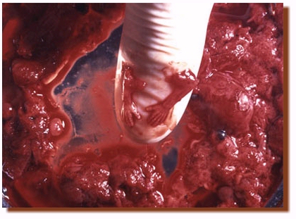 La fotografía de abajo muestra el dedo pulgar de un médico sosteniendo los dos brazos del bebé, cuyo aborto fue realizado en la página anterior. En el segundo mes la mano y el antebrazo son del tamaño de la uña del dedo pulgar del médico.
