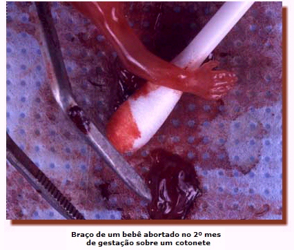 A fotografia abaixo mostra o dedo polegar de um médico segurando os dois braços do bebê cujo aborto foi realizado na página anterior. No segundo mês da gravidez a mão e o antebraço do bebê são do tamanho da unha do dedo polegar do médico.