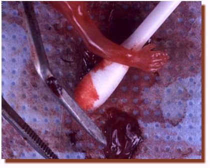 La fotografía de abajo muestra el dedo pulgar de un médico sosteniendo los dos brazos del bebé, cuyo aborto fue realizado en la página anterior. En el segundo mes la mano y el antebrazo son del tamaño de la uña del dedo pulgar del médico.