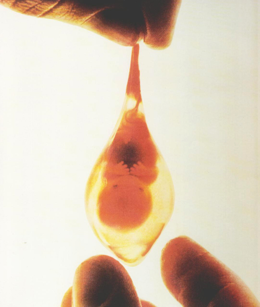 Esta fotografia se tomó después de una cirurgia en la Universidad de Minnesota por un fotografo medico del Departamento de Fotografia y Arte Medica en la Universidad. La madre habia tenido su ultima menstruación 6 semanas antes de la cirurgia. La fotografia ha sido originalmente publicada en el Boletín del Museo Bell de Patologia de la Universidad de Minnesota. El corazón empieza a latir entre el 18º y el 25º dia. La base de todo el sistema neuronal ya está lista en la tercera semana. En la sesta semana el esqueleto está listo y los reflejos están presentes. Ondas eletroencefalograficas ya se han registrado en la sesta semana. El cerebro y todos los organos del cuerpo ya están presentes en la octava semana. El momento de esta foto se ha producido seis semanas después del primer dia del último periodo menstrual de la madre, esto es, a las quatro semanas de embarazo o a los 15 dias de retardo menstrual. El embarazo empieza 15 dias antes del inicio del retardo menstrual. En un ciclo de 28 dias, en el dia 1 tenemos el inicio de la menstruación, en el dia 14 la ovulación o la fecundación, en el dia 28 empieza el retardo menstrual y, 15 dias más tarde, el bebé tiene las caracteristicas presentadas por esta foto. Foto de Robert Wolfe, Bell Museum of Pathology, University of Minnesota. Cf. J. C. Willke, Abortion, Hayes Publishing Co., Ohio. |